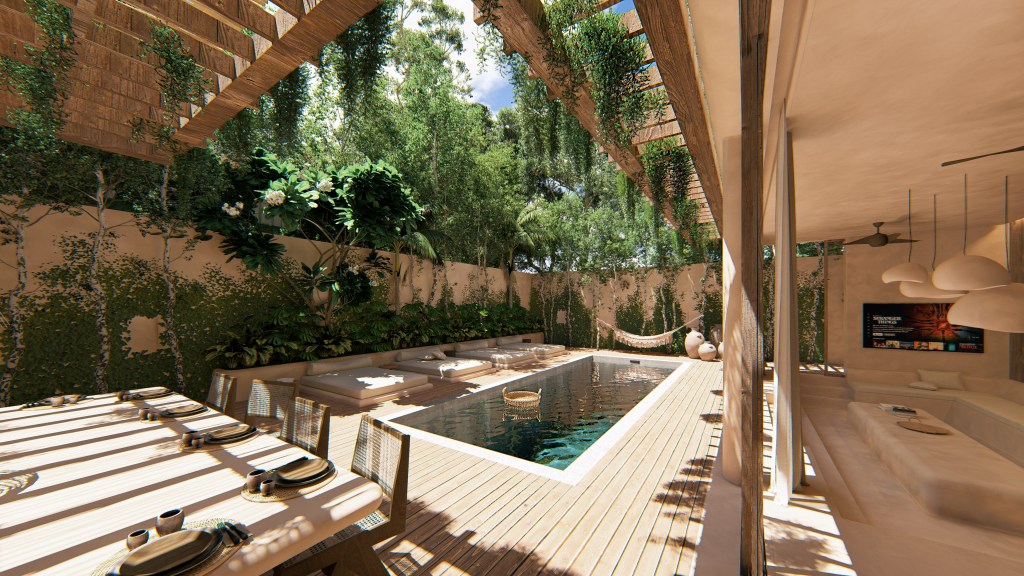The ground floor of the OSSANA villas is a true haven of peace, designed to offer a seamless indoor-outdoor living experience. This space is centered around a landscaped garden with a private pool, creating a natural harmony between architecture and the tropical environment.
