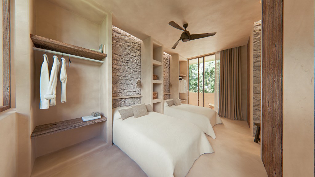 The upper floor of the OSSANA villas features four bedrooms and a shared living space, designed to combine comfort and versatility.