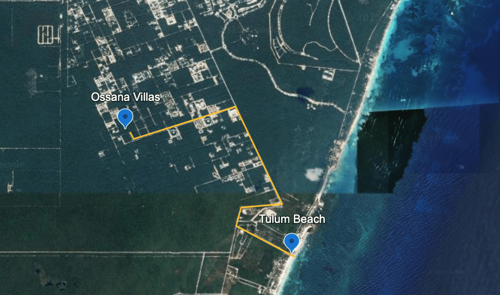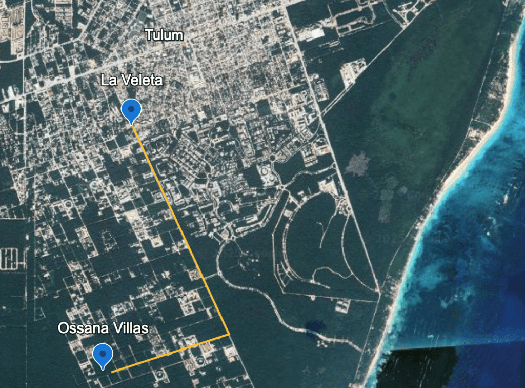This map highlights the prime location of Ossana Villas, nestled in the peaceful Zone 15 of Tulum — only 10 minutes by bike from the stunning beaches and vibrant hotel zone.